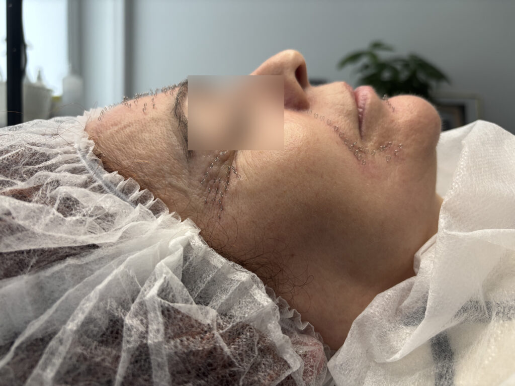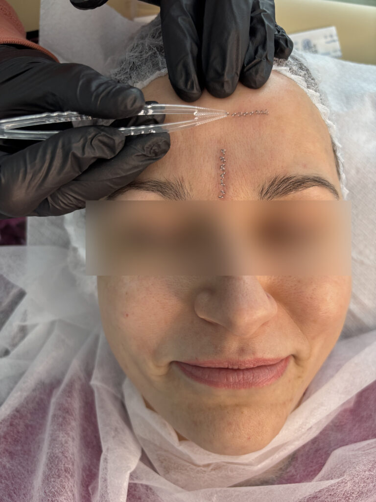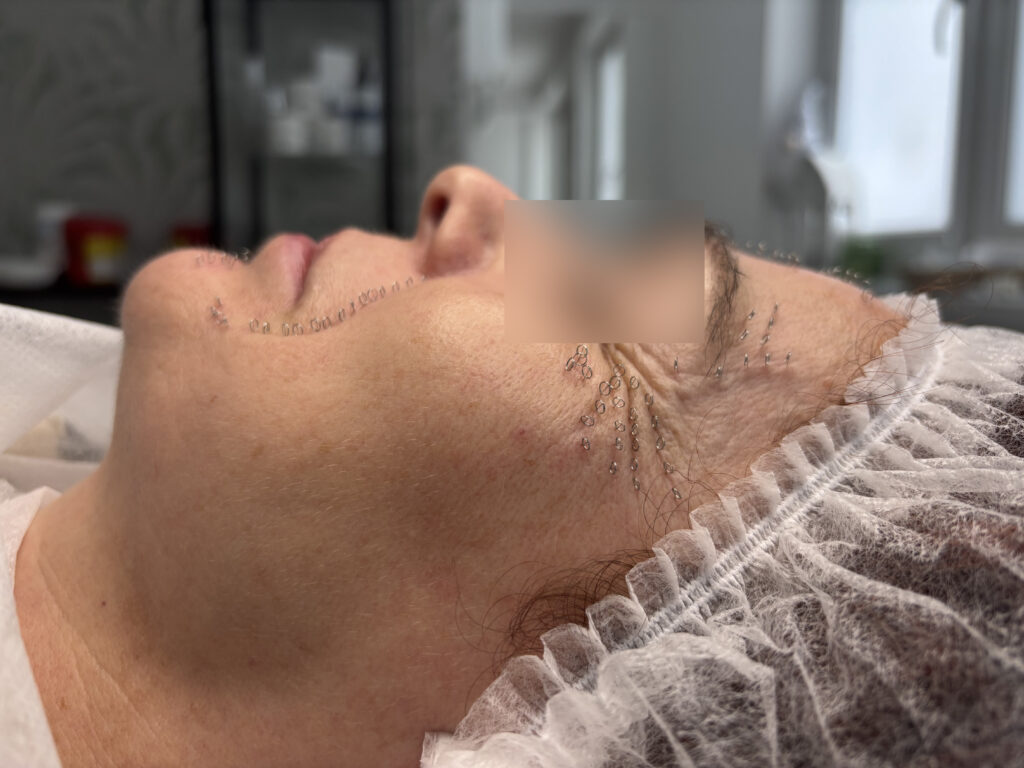 2. Pinezkowanie – bywa nazywane akupunkturą kosmetologiczną, ze względu na wykorzystanie igły = pinezki (igła zakończona kółkiem) w niewielkim rozmiarze 0.12-0.18 mm grubości pinezki oraz 3-5mm długości ostrza. Pinezkę aplikujemy pensetą i pozostawiamy do 40 minut w tkance. W tym czasie Pacjent nie powinien zmieniać pozycji ciała, dotykać twarzy, otwierać oczu, prowadzić dialogów, rozmów telefonicznych. Aplikacja pinezki związana jest wyłącznie z powstałymi asymetriami i napięciami w obrębie struktur anatomicznych (nie ma nic wspólnego z akupunkturowym wykorzystaniem meridian ciała i punktów energetycznych).